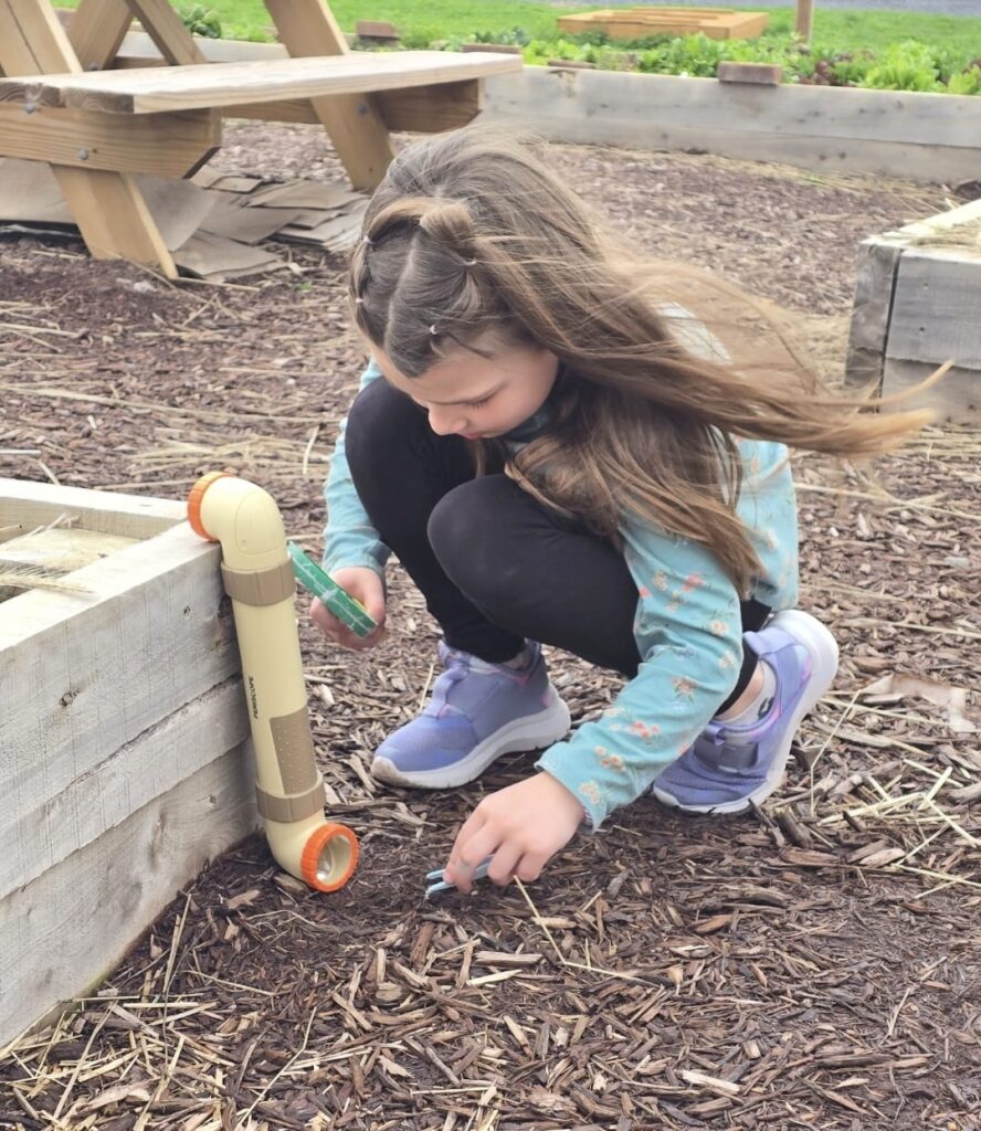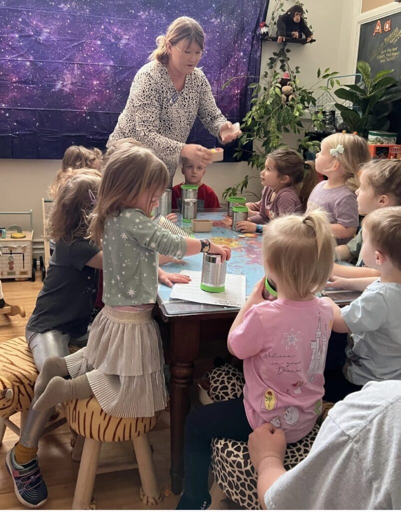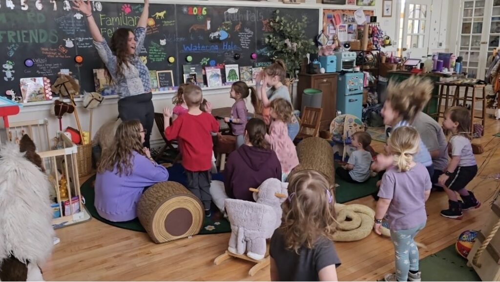Fifteen minutes of free-play is how we start the day! Wild Child at it’s best! Child-led play: nurturing friendships, climbing in the tree house, or playing games. Commence to the “watering hole,” where I introduce that day’s lesson, often led by a relevant song or storybook!