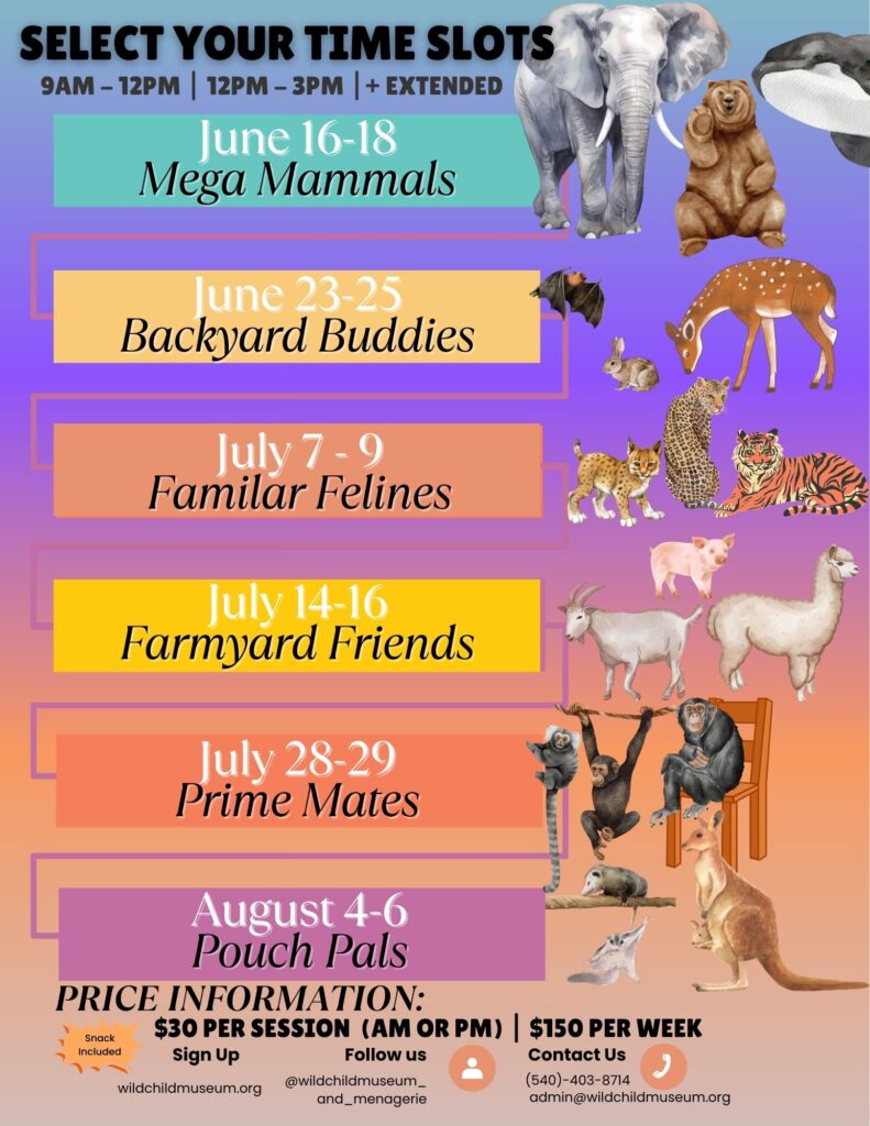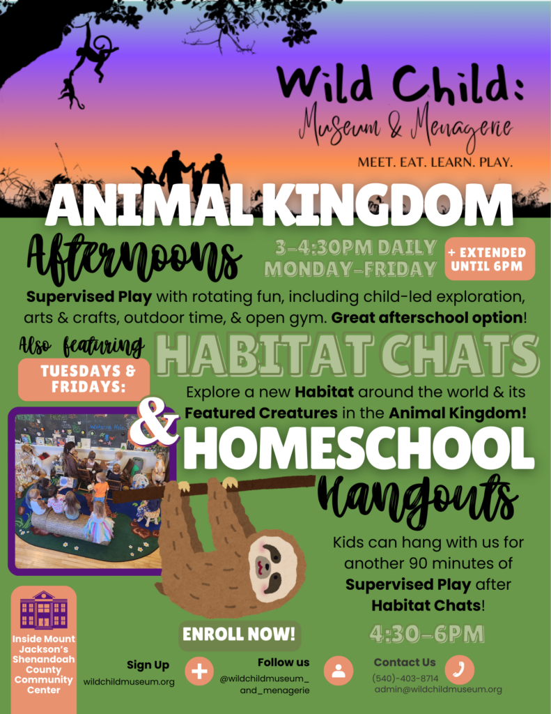 Our exciting “Animal Kingdom Afternoon” program is offered daily on Mondays-Fridays starting at 3pm. Families are able to arrange for their children to be dropped off by the Shenandoah County Public School buses at the Community Center and spend their afternoons getting wild with us! Parents can schedule “Extended Stay” until 6pm as the latest possible pick-up.