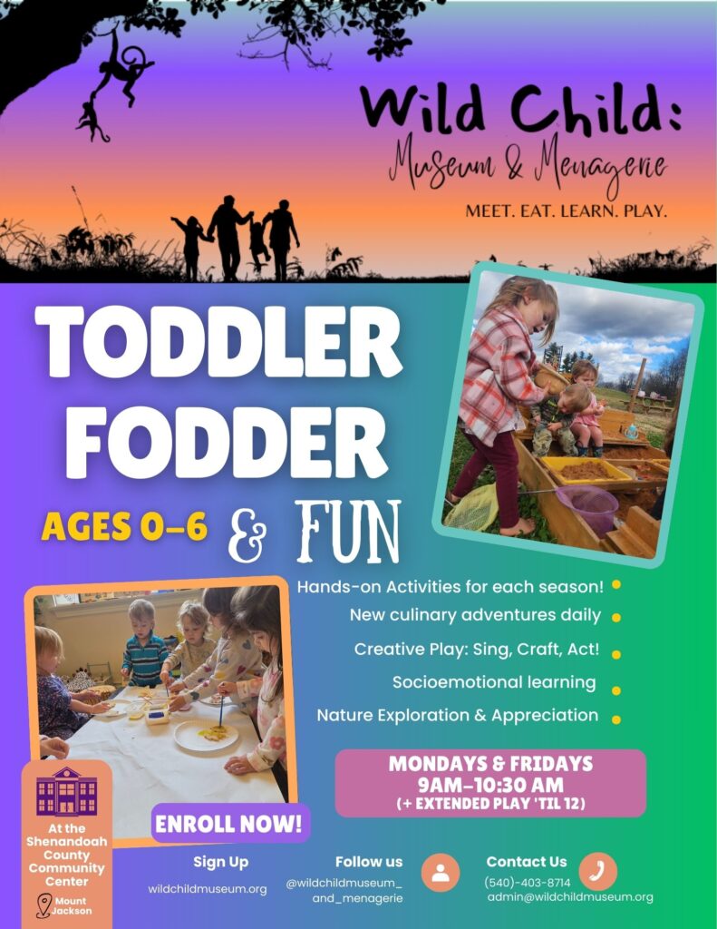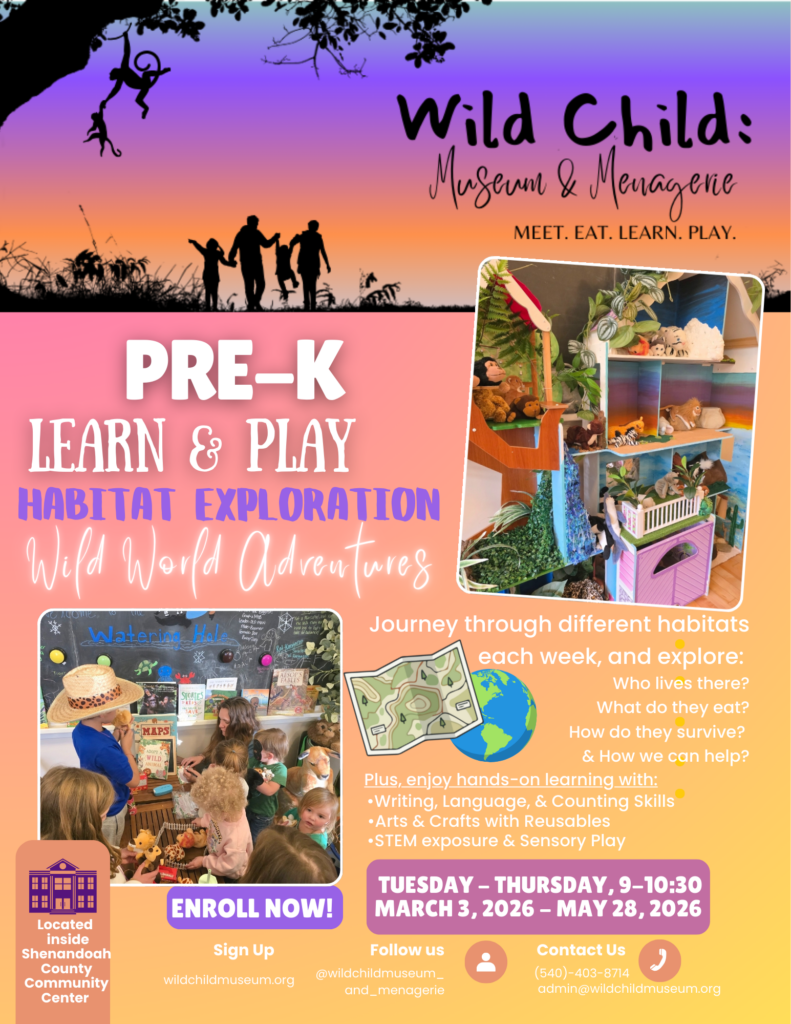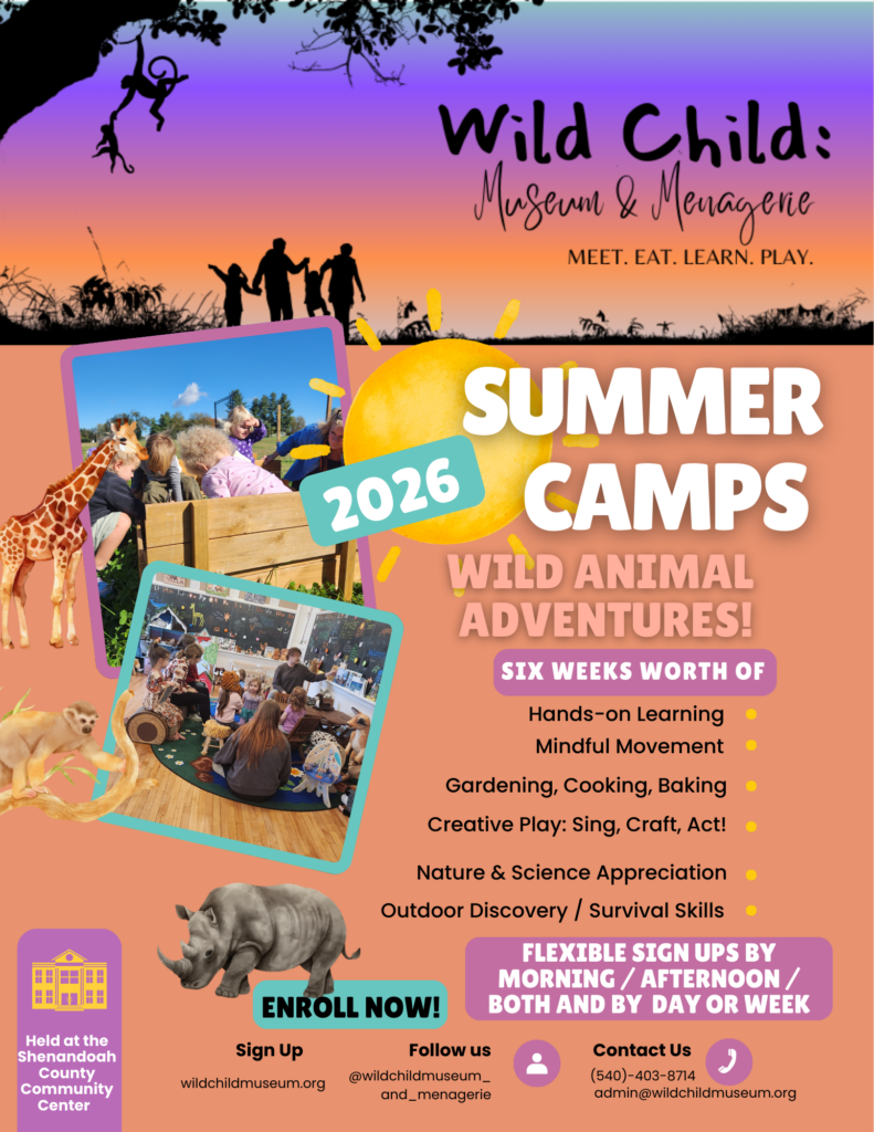 Let your child get WILD with us! This is an appointment-only drop-in care program at the Shenandoah County Community Center designed for your maximum convenience so we can watch your wild animals of the “tiny human” variety while you take care of some of your other needs as a busy parent or caregiver, like coworking in the Rotary Learning Lab next door, working up a sweat in the gym or movement studio, or taking care of business.