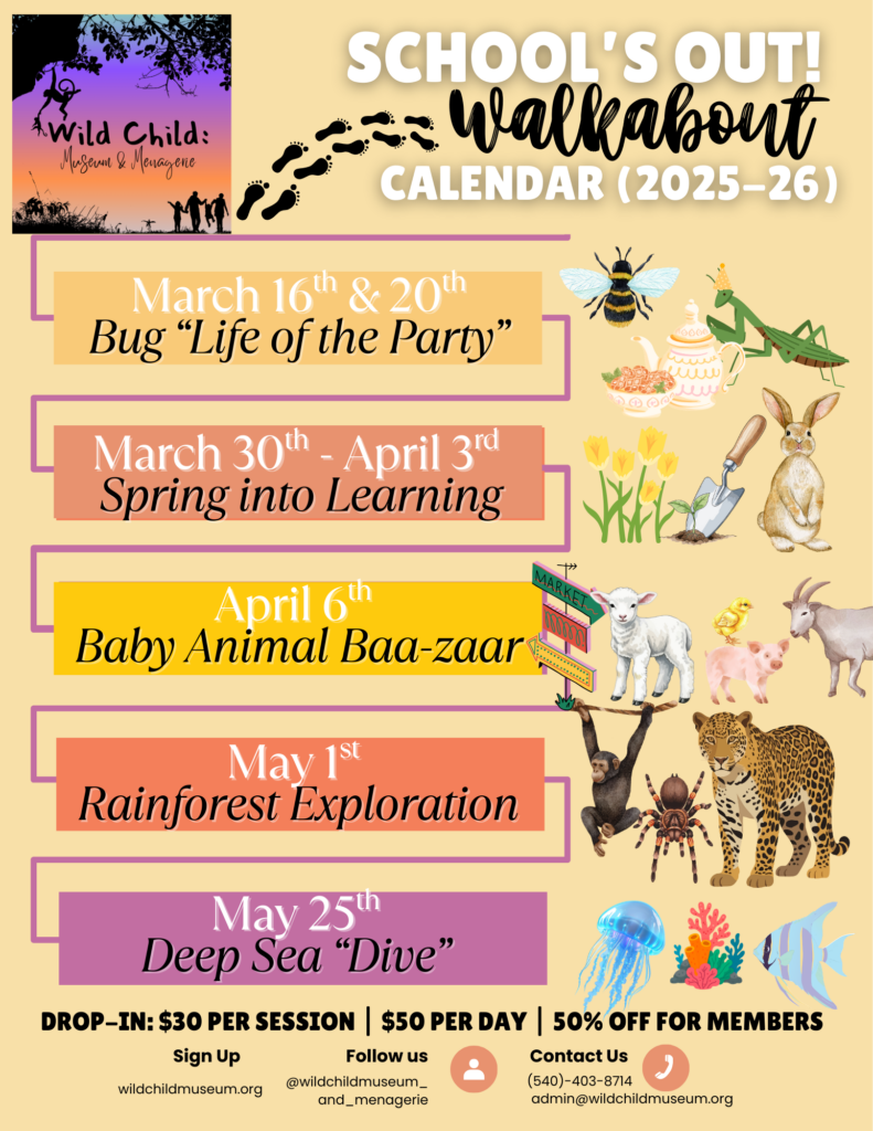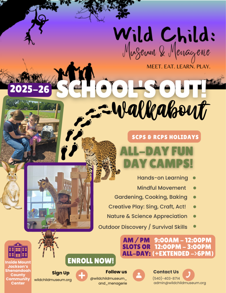 We are pleased to offer Day Camps whenever the local Shenandoah County Public School and Rockingham County Public School systems are closed with our new “School’s Out! Walkabout” series.
