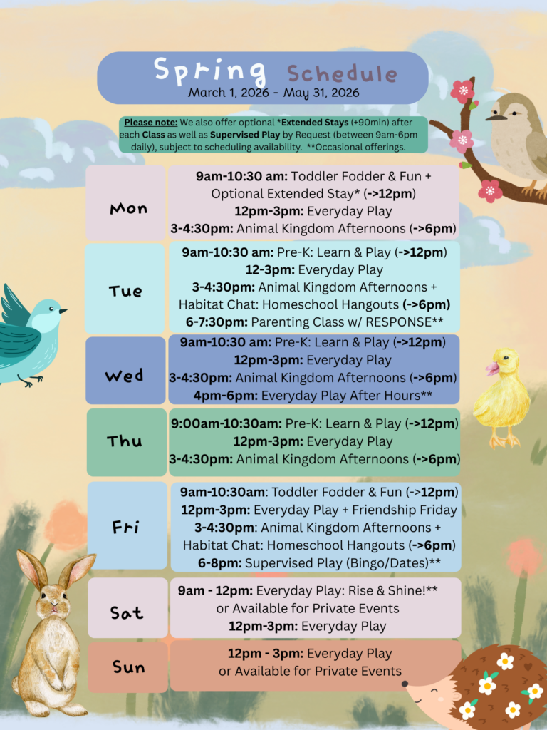 We are now welcoming a new group of friends to join us on this semester’s “Pre-K Learn & Play: Wild World Adventures,” Tuesdays – Thursdays, 9-10:30am! These classes are perfect for little learners ages 2-5, but we always welcome older or younger siblings to join in on the fun, too! Plus, families are welcome to book the “Extended Stay” option with a back-to-back 90-minute “Supervised Play” session until 12pm, if they’d like some more time to take care of business while their little one meets, eats, learns, and plays!